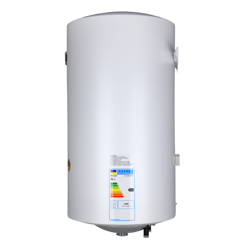 Надійний накопичувальний електричний водонагрівач WILLER EV100R-FOLK циліндричної форми об'ємом 100 літрів. Оснащений занурювальним (мокрим) нагрівальним елементом потужністю 1,5 кВт. Внутрішній бак, виготовлений зі сталі, покритої титанокварцевою емаллю, і захисний магнієвий анод забезпечують тривалий термін експлуатації. Сфера застосування - нагрівання води для побутових цілей, для душу і ванни. Для використання в будинку, квартирі, на дачі.