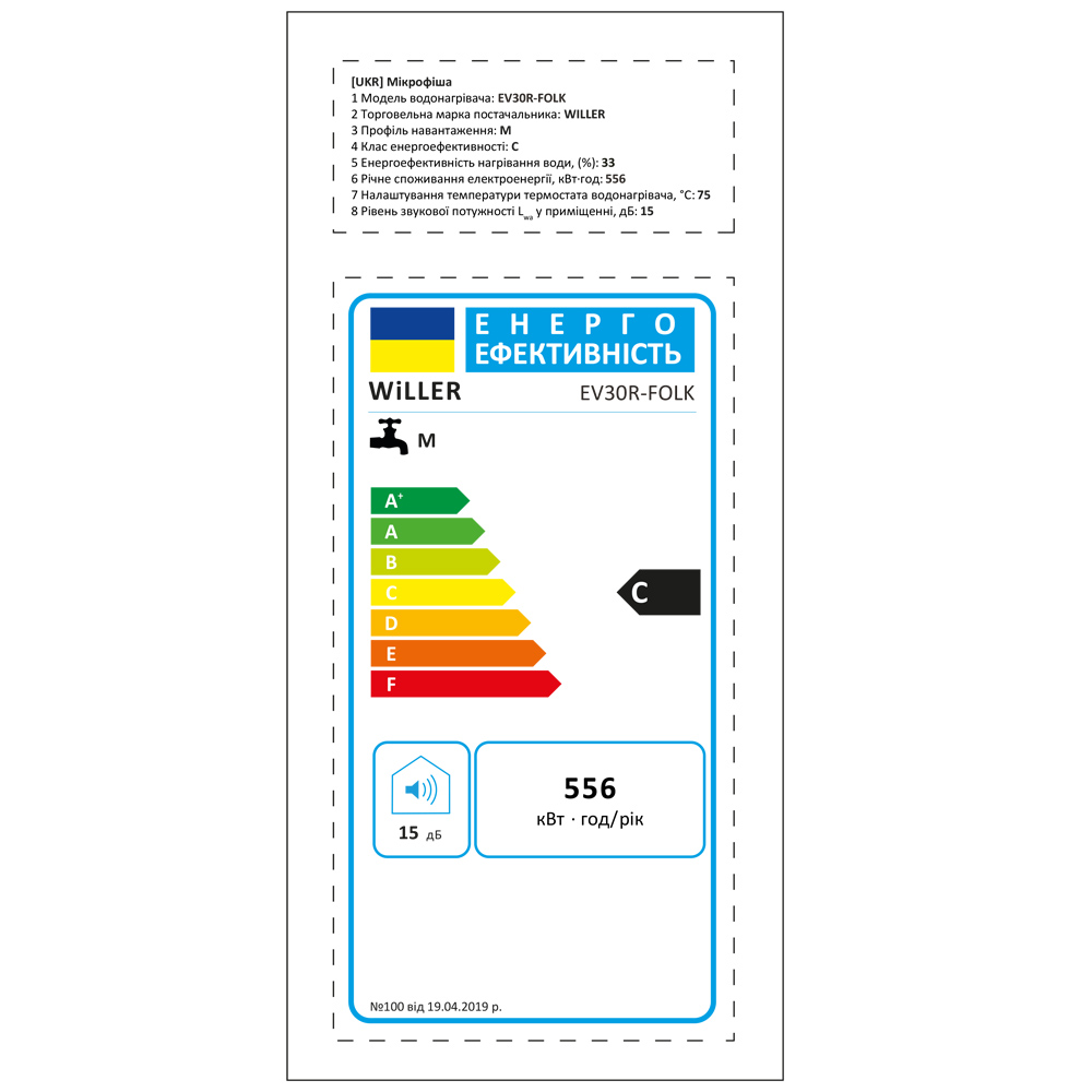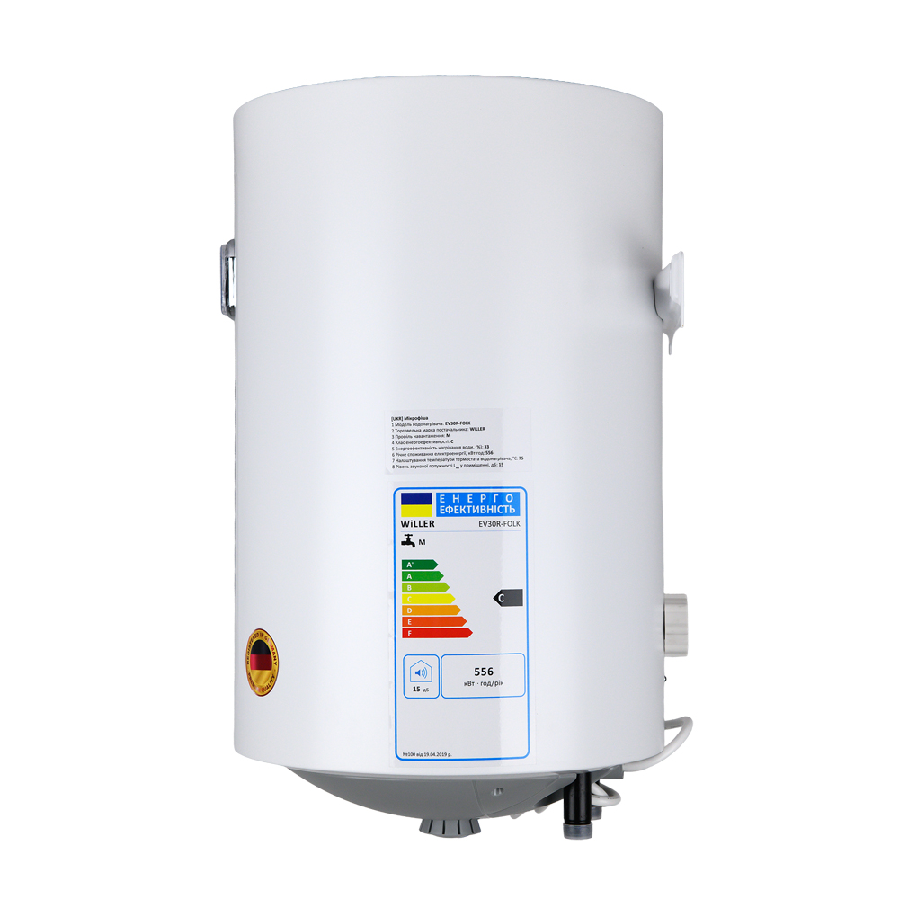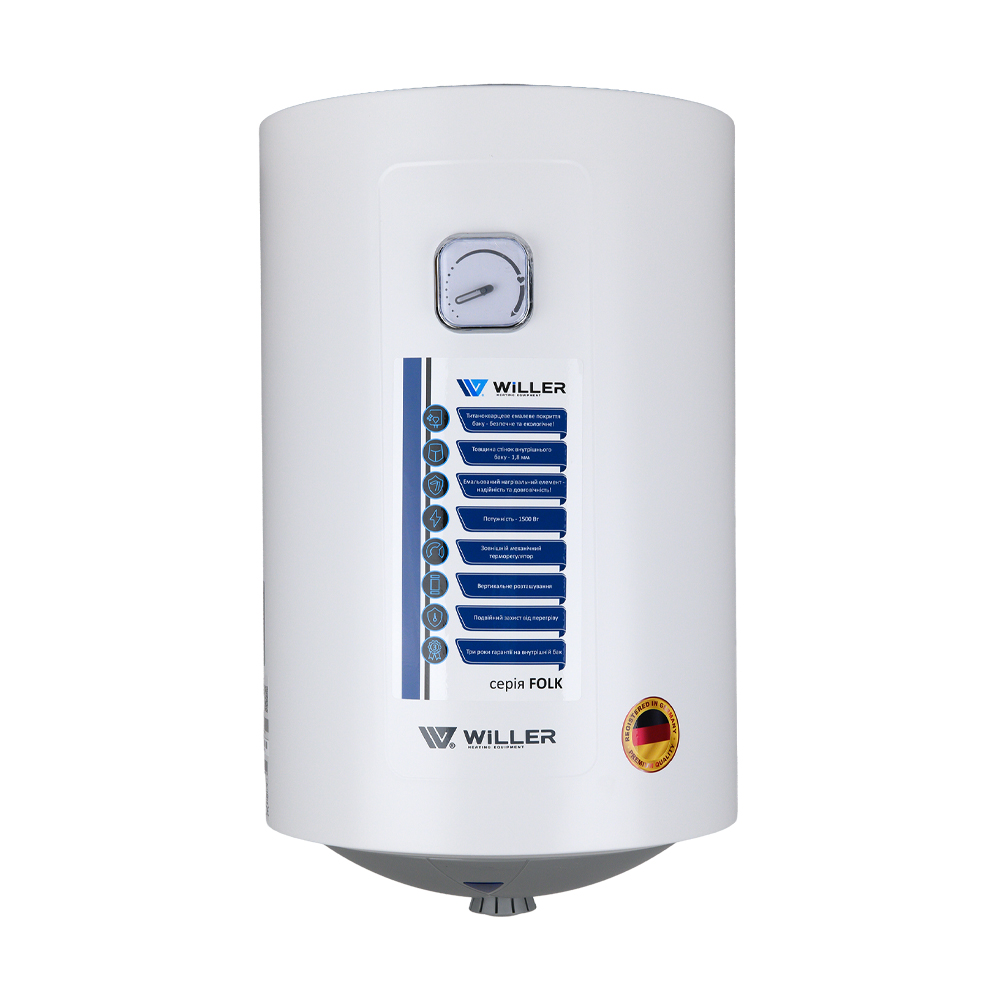 Надійний накопичувальний електричний водонагрівач WILLER EV30R-FOLK циліндричної форми об'ємом 30 літрів. Оснащений занурювальним (мокрим) нагрівальним елементом потужністю 1,5 кВт. Внутрішній бак, виготовлений зі сталі, покритої титанокварцевою емаллю, і захисний магнієвий анод забезпечують тривалий термін експлуатації. Сфера застосування - нагрівання води для побутових цілей, для душу і ванни. Для використання в будинку, квартирі, на дачі.